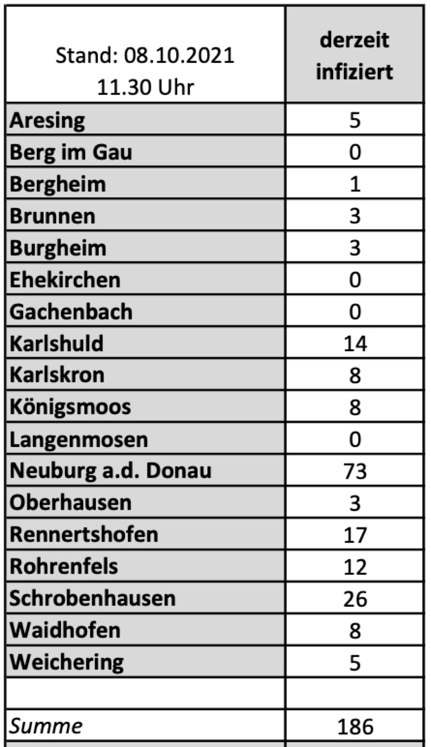 (ty) Im Kreis Neuburg-Schrobenhausen gibt es in Zusammenhang mit der Corona-Pandemie ein weiteres Menschenleben zu beklagen. Wie das Landratsamt heute mitteilte, ist eine über 80 Jahre alte Frau aus Neuburg gestorben, die zum Todeszeitpunkt als corona-positiv galt. Damit erhöht sich die Zahl der Corona-Toten im Landkreis auf nunmehr 86. Die weitere Situation im Kreis stellt sich laut aktuellen Angaben des Landratsamts wie folgt dar: Bislang – Stand: heute, 11.30 Uhr – wurden insgesamt 4880 Landkreis-Bürger positiv auf den neuartigen Erreger getestet. Das sind elf mehr als gestern gemeldet. Von den Infizierten gelten mittlerweile 4608 als genesen – unverändert seit gestern. Momentan gebe es im Landkreis 186 aktive Corona-Fälle (gestern: 176). Aktuelle Zahlen aus den Gemeinden zeigt die Tabelle unten. Seit 2. September gelten bayernweit völlig neue Corona-Regeln (Details siehe unten).
