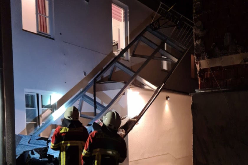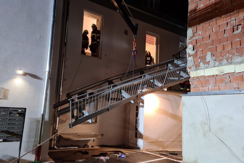 Nach Angaben der Polizeibeamten befand sich der Balkon nach dem Zwischenfall in einer instabilen Lage und drohte, von dem Vordach herunter zu stürzen. Deshalb wurde die Situation von den Feuerwehrleuten zunächst "eingefroren", wie die Floriansjünger selbst berichten. "Der Balkon wurde mittels Baustützen unterbaut", heißt es dazu. Auf diese Weise sei gesichert worden, dass ein weiteres Abrutschen des schweren Konstrukts nicht mehr möglich gewesen sei. In Absprache mit der Polizei habe man sich schließlich darauf verständigt, "dass das Balkon-Konstrukt komplett zur Erdgleiche gebracht werden muss, um die davon ausgehende Gefahr komplett zu bannen".