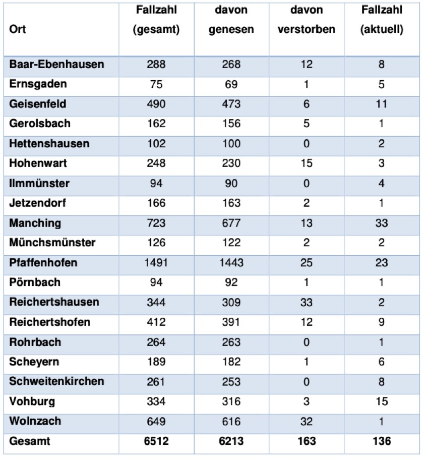 Von den bislang insgesamt 6512 Menschen aus dem Kreis Pfaffenhofen, bei denen nach jüngstem offiziellen Stand eine Corona-Infektion bestätigt worden ist, gelten laut aktueller Mitteilung der Behörde mittlerweile 6213 als genesen – das sind 36 mehr als am Freitag gemeldet. Die Zahl der infizierten und noch nicht genesenen Corona-Patienten hat sich damit im Landkreis verringert und beträgt – Stand: heute Nachmittag – derzeit 136 (Freitag: 143). Die infizierten Personen befinden sich in häuslicher Isolation.