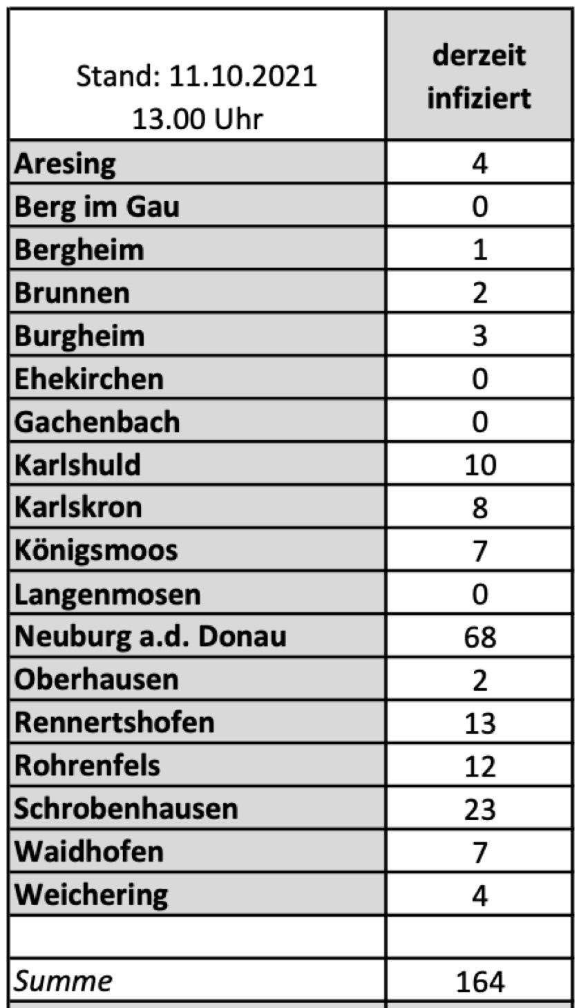 (ty) Im Kreis Neuburg-Schrobenhausen gibt es in Zusammenhang mit der Corona-Pandemie, wie berichtet, mittlerweile 86 Menschenleben zu beklagen. Die weitere Situation im Kreis stellt sich laut aktuellen Angaben des Landratsamts wie folgt dar: Bislang – Stand: heute, 13 Uhr – wurden insgesamt 4890 Landkreis-Bürger positiv auf den neuartigen Erreger getestet. Das sind zehn mehr als am Freitag gemeldet. Von den Infizierten gelten mittlerweile 4640 als genesen – das sind 32 mehr als am Freitag gemeldet. Momentan gebe es im Landkreis 164 aktive Corona-Fälle (Freitag: 186). Aktuelle Zahlen aus den Gemeinden zeigt die Tabelle unten. Seit 2. September gelten bayernweit völlig neue Corona-Regeln (Details siehe unten).