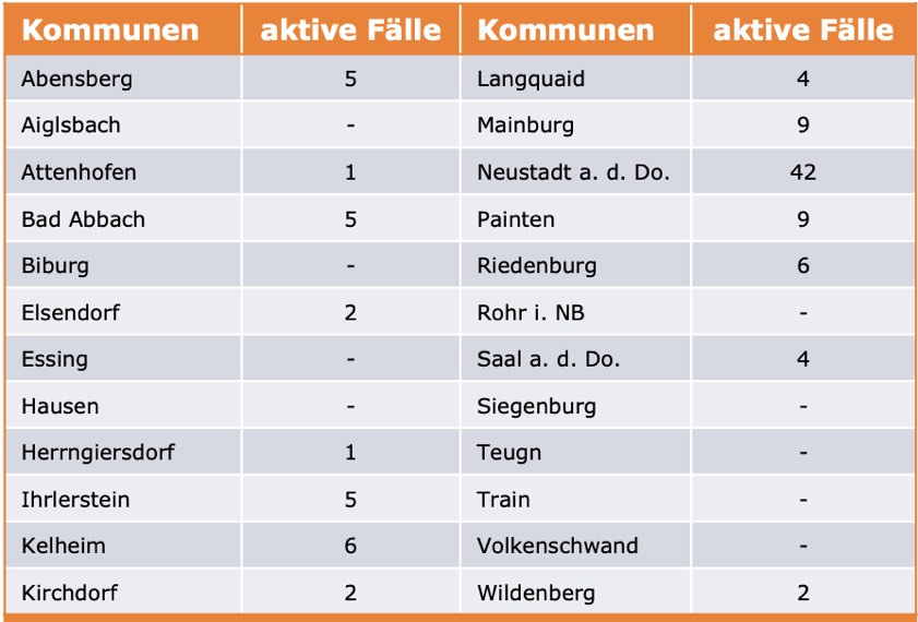 (ty) Im Kreis Kelheim gibt es in Zusammenhang mit der Corona-Pandemie ein weiteres Menschenleben zu beklagen. Wie das Landratsamt heute mitteilte, ist eine mit Corona infizierte Frau (Jahrgang 1934) gestorben, die unter einer Vorerkrankung litt. Damit erhöht sich die Zahl der Corona-Toten im Landkreis auf nunmehr 112. Die weitere Situation stellt sich wie folgt dar: Unter Verweis auf Daten des Gesundheitsamts teilte das Landratsamt heute mit, dass – Stand gestern, 16 Uhr – die Zahl der im Kreis Kelheim positiv auf den neuartigen Erreger getesteten Menschen bei insgesamt 6977 liegt: Das sind 15 mehr als gestern gemeldet. Derzeit gebe es 103 aktive Corona-Fälle im Landkreis (gestern: 93). Zahlen aus den einzelnen Gemeinden zeigt die Tabelle unten. Seit 2. September gelten bayernweit völlig neue Corona-Regeln (Details siehe unten).