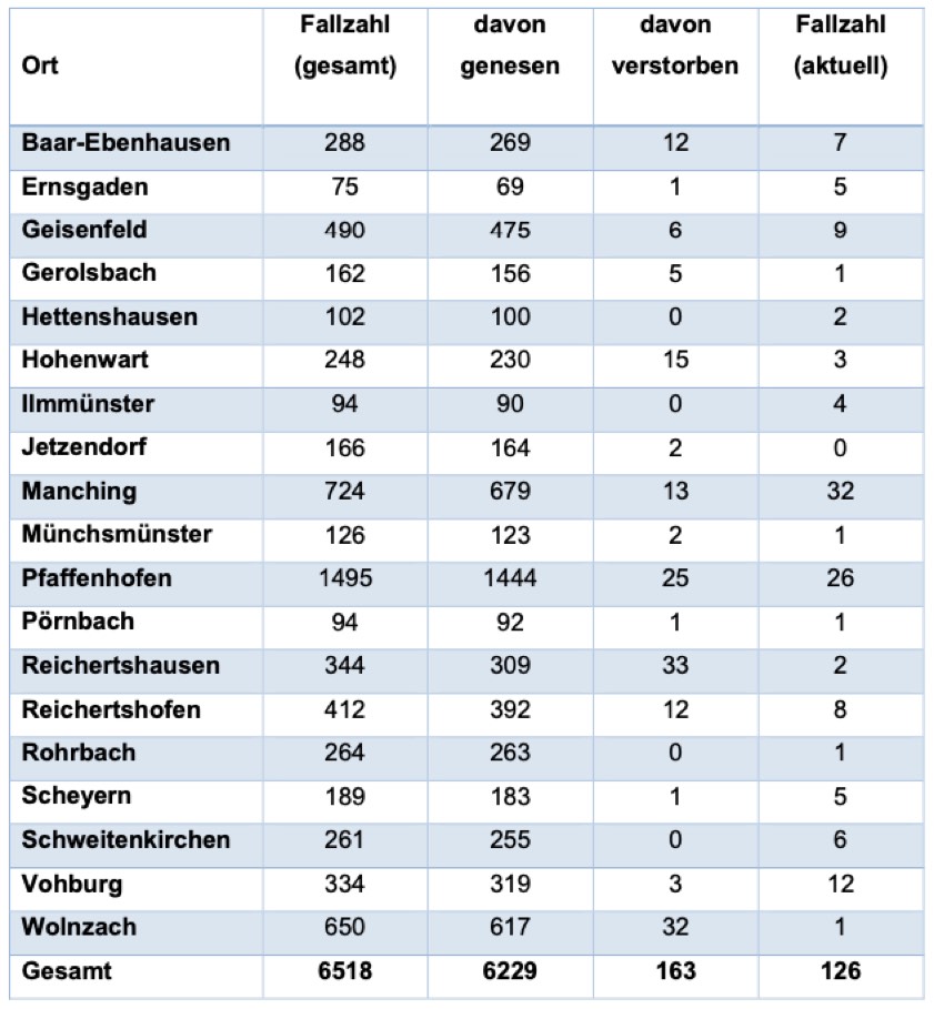 (ty) In Zusammenhang mit der Corona-Pandemie gibt es im Kreis Pfaffenhofen, wie berichtet, mittlerweile 163 Menschenleben zu beklagen. Das Landratsamt veröffentlicht eine tägliche Übersicht (Tabelle unten), in welchen Gemeinden die mit dem Virus infizierten Menschen, die gestorben sind, gelebt haben beziehungsweise wie viele bestätigte Infektionsfälle und genesene Patienten es in welcher Kommune gibt. Die Zahl der Landkreis-Bürger, die positiv auf den neuartigen Erreger getestet worden sind, hat sich seit der Meldung von gestern um sechs erhöht und beträgt somit aktuell 6518. Seit 2. September gelten bayernweit völlig neue Corona-Regeln (Details siehe unten).