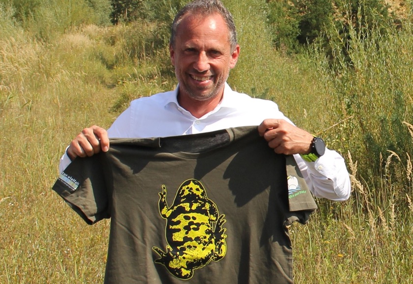Der bayerische Umweltminister Thorsten Glauber mit einem Gelbbauchunken-Shirt.