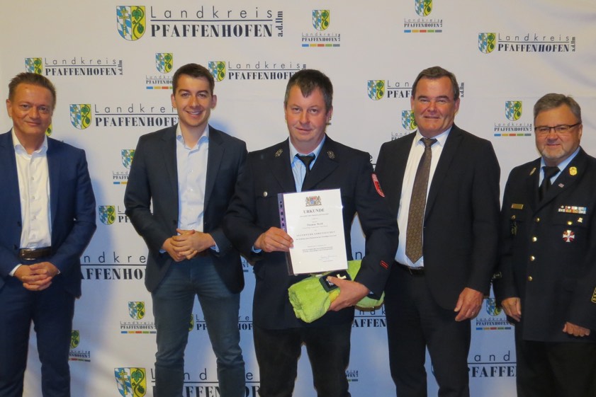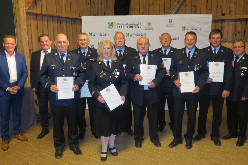 (ty) Bei der dritten Feuerwehr-Ehrung für das laufende Jahr hat der Pfaffenhofener Landrat Albert Gürtner jetzt langjährige Floriansjünger aus den Gemeinden Pfaffenhofen und Rohrbach ausgezeichnet. Insgesamt 15 Männer und eine Frau aus den Freiwilligen Feuerwehren von Pfaffenhofen, Tegernbach, Rohrbach, Fahlenbach und Waal wurden dabei für 25 beziehungsweise 40 Jahre im aktiven Dienst gewürdigt. Gürtner dankte ihnen für ihr langjähriges ehrenamtliches Engagement für Gesellschaft und Gemeinwohl. Mit dabei waren auch Kreisbrandrat Armin Wiesbeck und der Landtags-Abgeordnete Karl Straub sowie der Rohrbacher Bürgermeister Christian Keck und der Pfaffenhofener Vize-Bürgermeister Roland Dörfler.