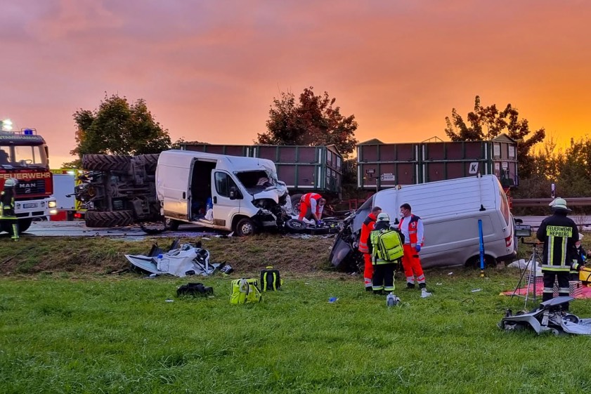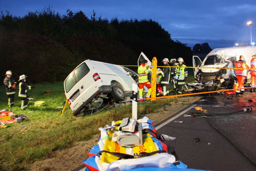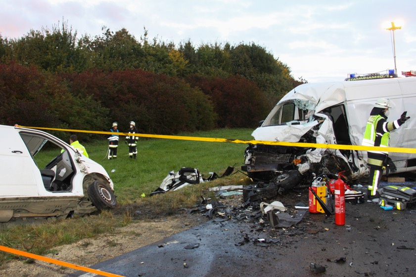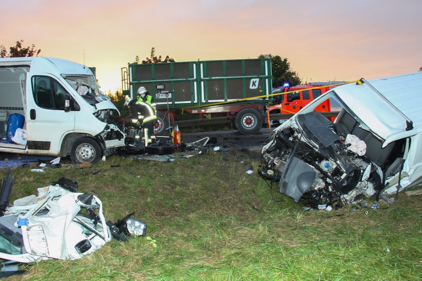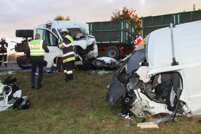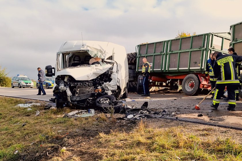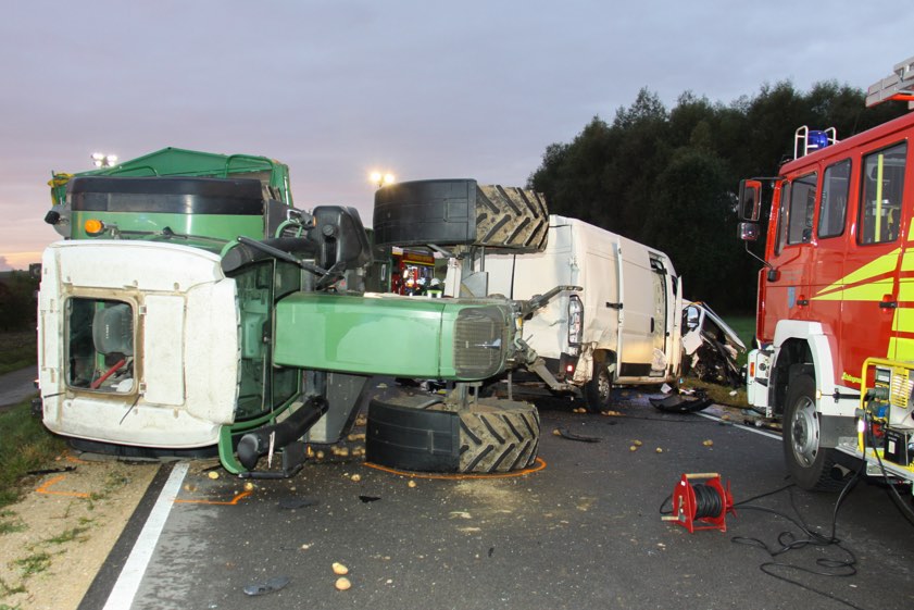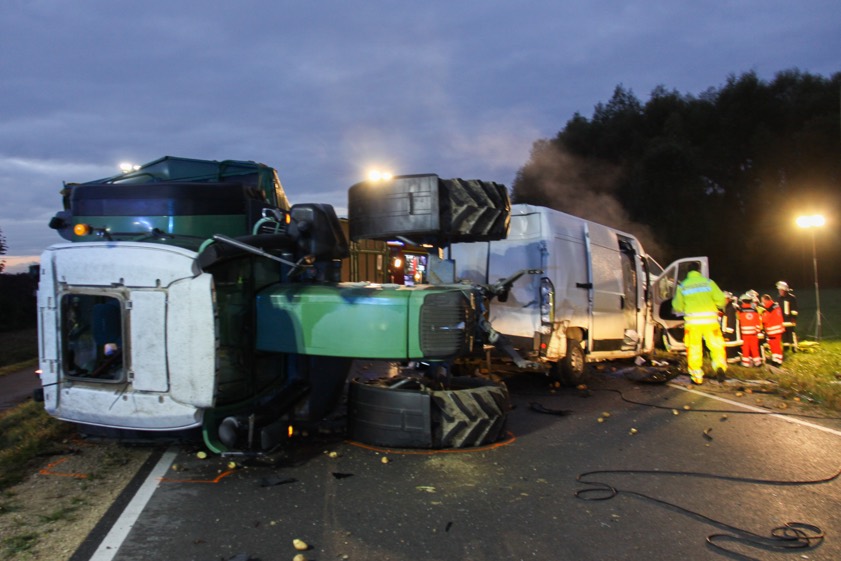 Nach Angaben der Polizei krachten die beiden Kastenwagen frontal zusammen. Der 35-Jährige habe noch versucht, abzubremsen beziehungsweise auszuweichen; dadurch sei sein Traktor auf die rechte Seite gekippt. Der 55-jährige Kastenwagen-Fahrer erlitt laut Polizei tödliche Verletzungen; die eingeleiteten Reanimations-Maßnahmen waren ohne Erfolg geblieben. Der 22-jährige Kastenwagen-Fahrer habe schwere Verletzungen erlitten; er wurde nach der Erstversorgung vor Ort in ein Krankenhaus gebracht. Der leicht verletzte Traktor-Fahrer sei zur ambulanten Behandlung in ein Krankenhaus gebracht worden.