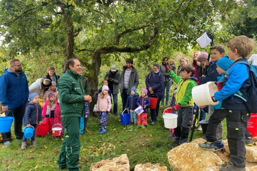(ty) Die Buben und Mädchen von der Kita "Burzlbaam" in der Kreisstadt haben in diesem Jahr den Anfang gemacht. Im Rahmen des Artenschutz-Projekts "Pfaffenhofen soll blühen" haben sie bereits im zweiten Jahr hintereinander tatkräftig die Apf-Elernte unterstützt und damit die ersten Äpfel zur Aktion "Dein Apfelsaft spendet Bäume" gesammelt (Fotos). Wie die Pfaffenhofener Stadtwerke berichten, haben die Kinder mit ihren Eltern und Mario Dietrich, dem obersten Gärtner des Kommunal-Unternehmens, die Früchte auf der Streuobstwiese an der oberen Ziegelstraße geerntet. Die Äpfel seien danach gleich zu Saft weiterverarbeitet worden.