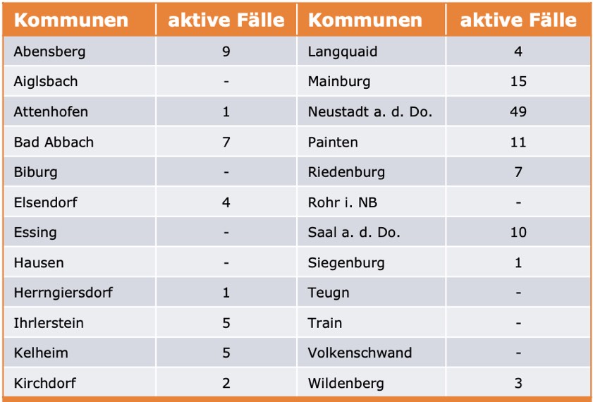 (ty) Im Kreis Kelheim gibt es in Zusammenhang mit der Corona-Pandemie ein weiteres Menschenleben zu beklagen. Wie das Landratsamt heute mitteilte, ist eine mit dem Virus infizierte Frau (Jahrgang 1968) gestorben, die unter einer Vorerkrankung litt. Damit erhöht sich die Zahl der Corona-Toten im Landkreis auf nunmehr 113. Die weitere Situation stellt sich wie folgt dar: Unter Verweis auf Daten des Gesundheitsamts teilte das Landratsamt heute mit, dass – Stand gestern, 16 Uhr – die Zahl der im Kreis Kelheim positiv auf den neuartigen Erreger getesteten Menschen bei insgesamt 7034 liegt: Das sind 16 mehr als gestern gemeldet. Insgesamt 6787 hiesige Corona-Patienten wurden wieder aus der Quarantäne entlassen und gelten als genesen (gestern: 6779). Derzeit gebe es 134 aktive Corona-Fälle im Landkreis (gestern: 127). Zahlen aus den einzelnen Gemeinden zeigt die Tabelle unten. Seit 2. September gelten bayernweit völlig neue Corona-Regeln (Details siehe unten).