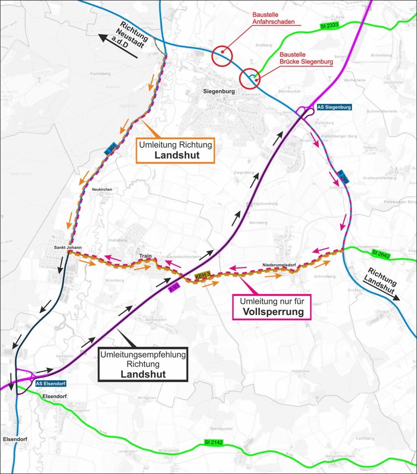 Die unten gezeigte Karte veranschaulicht die Verkehrs-Situation und die Umleitungs-Strecken. Insbesondere dem Schwerverkehr wird in einer Presse-Information des staatlichen Bauamts aber empfohlen, die Autobahn A93 zu nutzen. Ab dem kommenden Montag sei die Bundesstraße dann wieder – wie bisher – einspurig in Richtung Neustadt an der Donau befahrbar. Die Verkehrsteilnehmer, die in Fahrtrichtung Landshut unterwegs sind, nehmen dann – ebenfalls wie bisher – weiter die Umleitung über Sankt Johann. "Komplett abgeschlossen sind die Arbeiten gegen Ende des Jahres", erklärte ein Behörden-Sprecher.