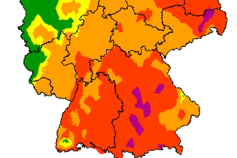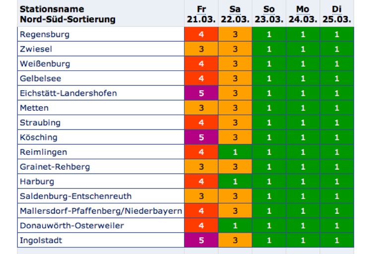Für morgen wird eine deutliche Entspannung der Lage prognostiziert. Die Gefährdung sinkt nach aktuellen Berechnungen in den genannten Regionen um zwei Stufen von 5 auf 3, in Roth sogar auf Stufe 2. In Neuburg sinkt die Gefährdung von 4 auf 3. Stufe 3 bedeutet: mittlere Gefährdung, Stufe 2 steht für geringe Gefährdung.