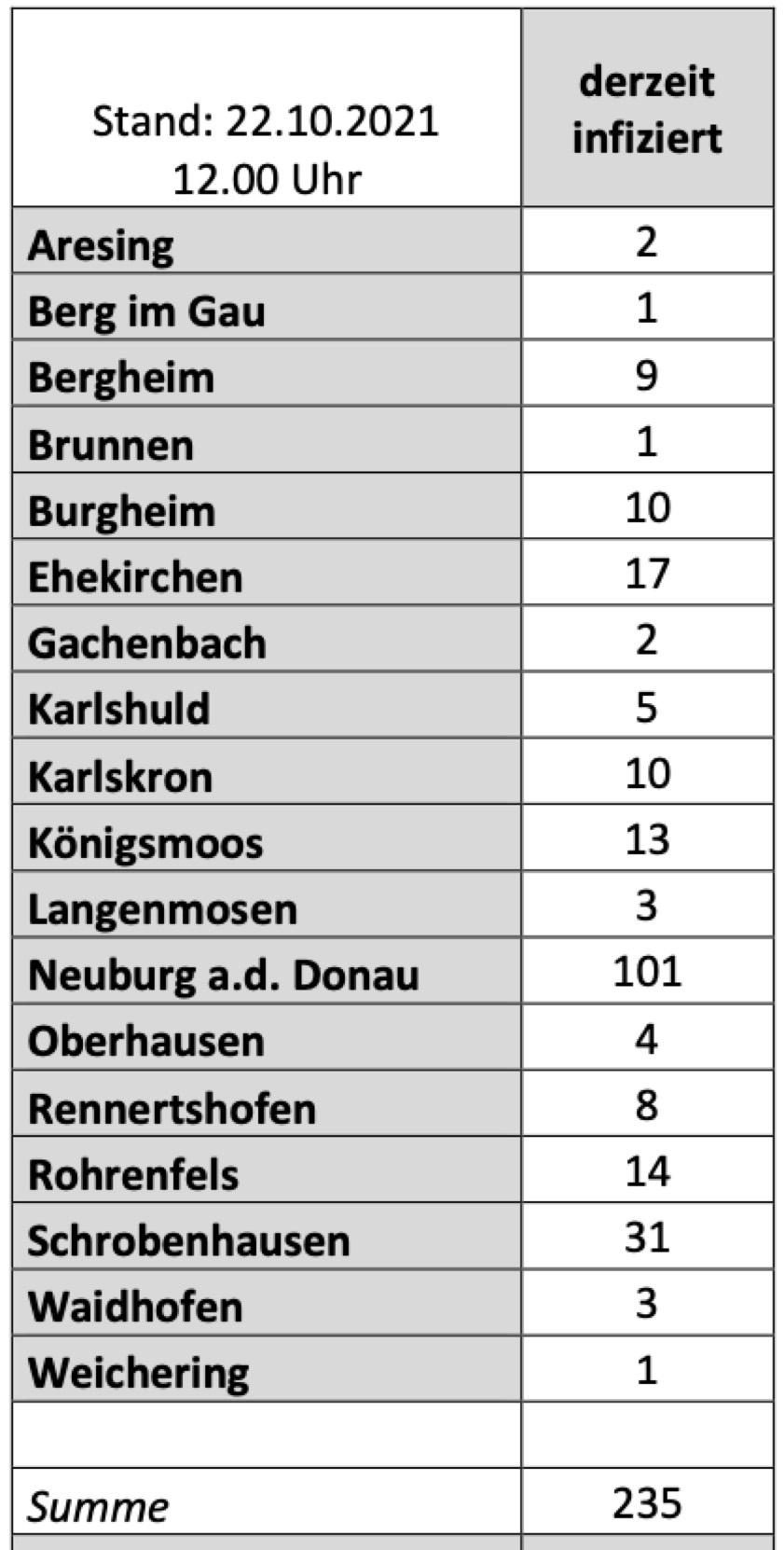 (ty) Im Kreis Neuburg-Schrobenhausen gibt es in Zusammenhang mit der Corona-Pandemie, wie berichtet, mittlerweile 86 Menschenleben zu beklagen. Die weitere Situation im Kreis stellt sich laut aktuellen Angaben des Landratsamts wie folgt dar: Bislang – Stand: heute, 12 Uhr – wurden insgesamt 5083 Landkreis-Bürger positiv auf den neuartigen Erreger getestet. Das sind 19 mehr als gestern gemeldet. Von den Infizierten gelten mittlerweile 4762 als genesen – zwölf mehr als gestern gemeldet. Momentan gebe es im Landkreis 235 aktive Corona-Fälle (gestern: 228). Aktuelle Zahlen aus den Gemeinden zeigt die Tabelle unten. Seit 2. September gelten bayernweit völlig neue Corona-Regeln (Details siehe unten).