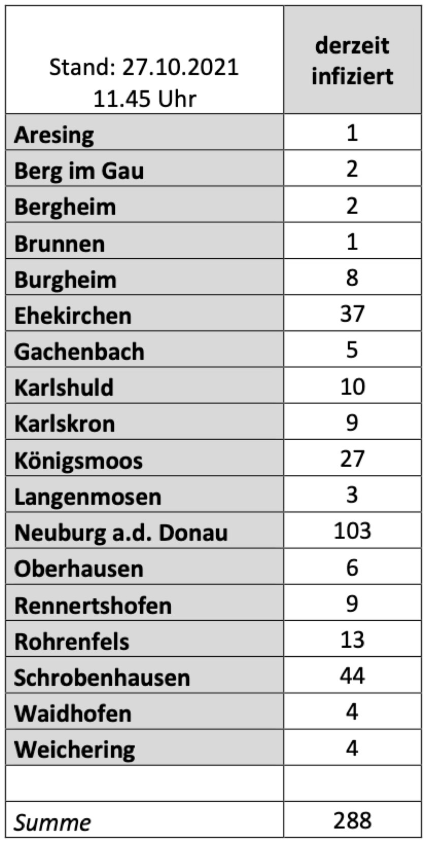 (ty) Im Kreis Neuburg-Schrobenhausen gibt es in Zusammenhang mit der Corona-Pandemie ein weiteres Menschenleben zu beklagen. Wie das Landratsamt gegenüber unserer Redaktion erklärte, ist ein über 60 Jahre alter Mann aus Neuburg gestorben, der zum Todes-Zeitpunkt als corona-positiv galt. Damit erhöht sich die Zahl der Corona-Toten im Landkreis auf nunmehr 87. Die weitere Situation im Kreis stellt sich laut aktuellen Angaben des Landratsamts wie folgt dar: Bislang – Stand: heute, 11.45 Uhr – wurden insgesamt 5192 Landkreis-Bürger positiv auf den neuartigen Erreger getestet. Das sind 33 mehr als gestern gemeldet. Von den Infizierten gelten mittlerweile 4817 als genesen – elf mehr als gestern gemeldet. Momentan gebe es im Landkreis 288 aktive Corona-Fälle (gestern: 267). Aktuelle Zahlen aus den Gemeinden zeigt die Tabelle unten. Seit 2. September gelten bayernweit völlig neue Corona-Regeln (Details siehe unten).