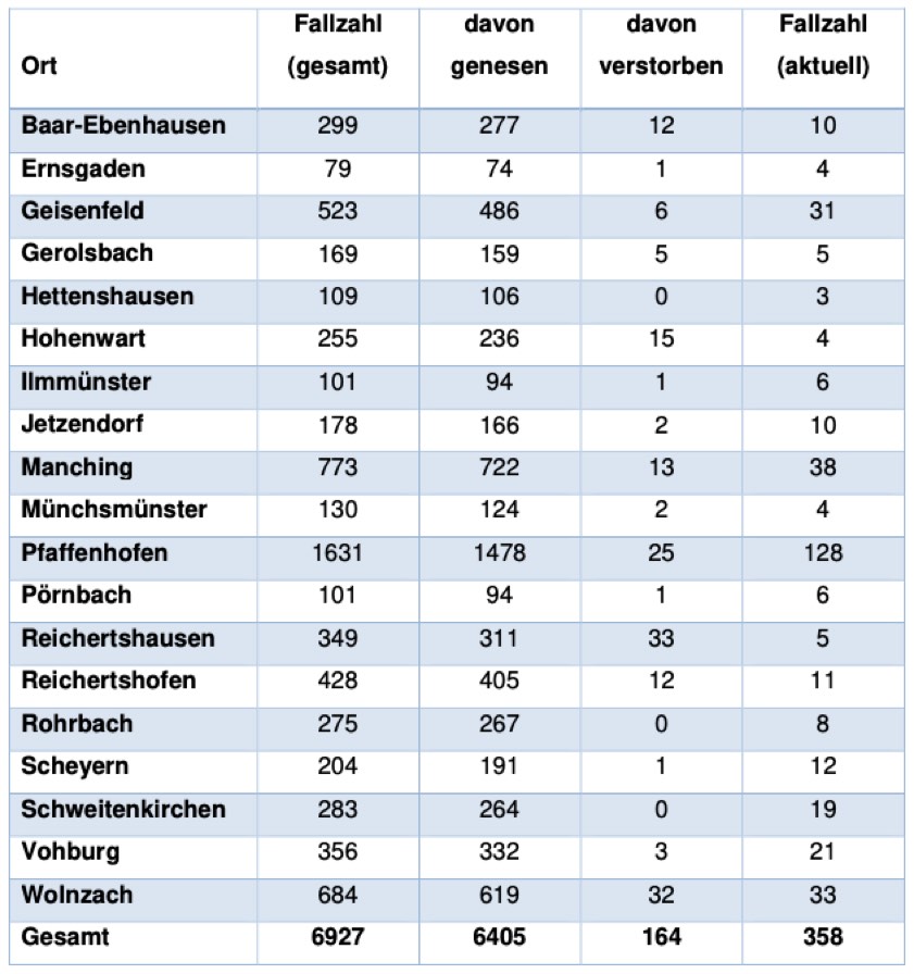 Von den bislang insgesamt 6927 Menschen aus dem Kreis Pfaffenhofen, bei denen nach jüngstem offiziellen Stand eine Corona-Infektion bestätigt worden ist, gelten laut aktueller Mitteilung der Behörde mittlerweile 6405 als genesen – das sind 19 mehr als gestern gemeldet. Die Zahl der infizierten und noch nicht genesenen Corona-Patienten hat sich damit im Landkreis deutlich erhöht und beträgt – Stand: heute Nachmittag – derzeit 358 (gestern: 294). Die infizierten Personen befinden sich in häuslicher Isolation.
