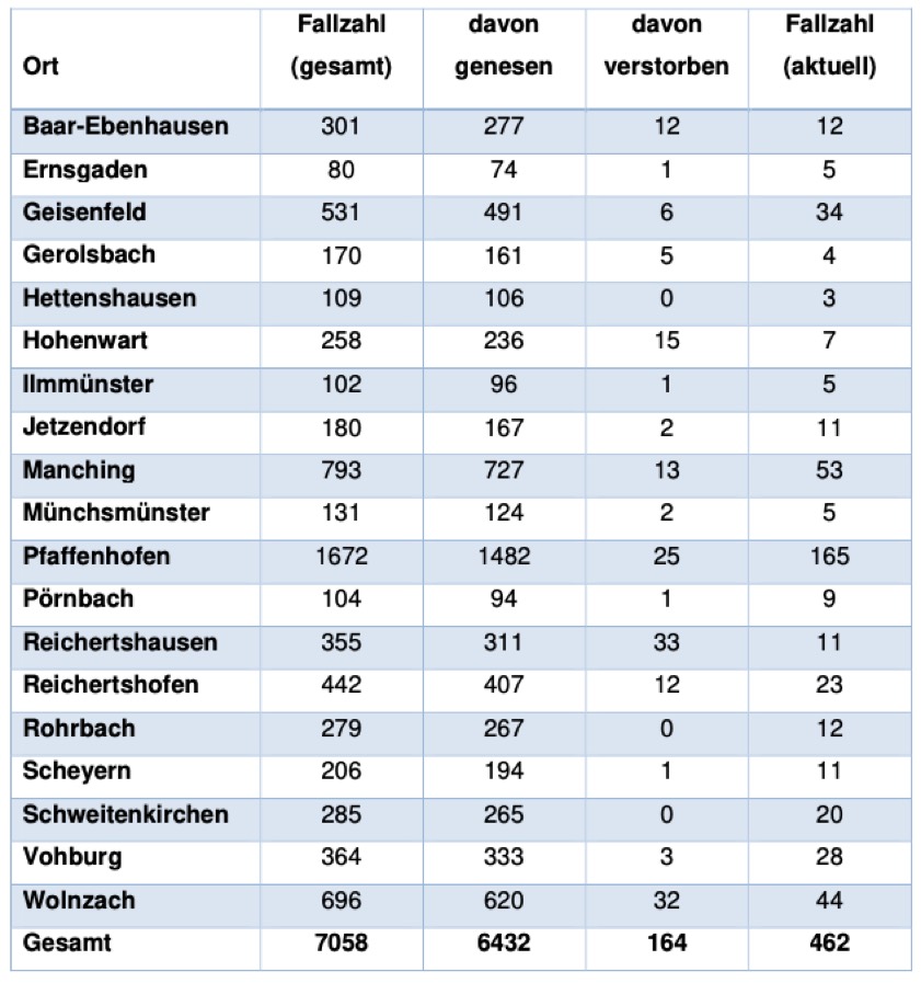 (ty) In Zusammenhang mit der Corona-Pandemie gibt es im Kreis Pfaffenhofen, wie berichtet, mittlerweile 164 Menschenleben zu beklagen. Das Landratsamt veröffentlicht eine tägliche Übersicht (Tabelle unten), in welchen Gemeinden die mit dem Virus infizierten Menschen, die gestorben sind, gelebt haben beziehungsweise wie viele bestätigte Infektionsfälle und genesene Patienten es in welcher Kommune gibt. Die Zahl der Landkreis-Bürger, die positiv auf den neuartigen Erreger getestet worden sind, hat sich seit der Meldung von gestern um 59 erhöht und beträgt somit aktuell 7058. Seit 2. September gelten bayernweit völlig neue Corona-Regeln (Details siehe unten).