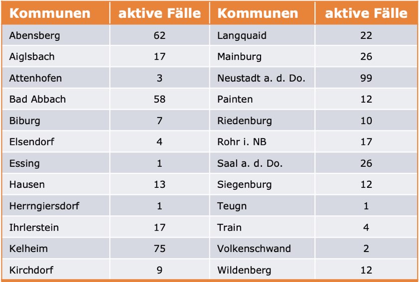 (ty) Im Kreis Kelheim gibt es in Zusammenhang mit der Corona-Pandemie, wie berichtet, mittlerweile 114 Menschenleben zu beklagen. Die weitere Situation stellt sich wie folgt dar: Unter Verweis auf Daten des Gesundheitsamts teilte das Landratsamt heute mit, dass – Stand gestern, 16 Uhr – die Zahl der im Kreis Kelheim positiv auf den neuartigen Erreger getesteten Menschen bei insgesamt 7875 liegt: Das sind 65 mehr als gestern gemeldet. Insgesamt 7251 hiesige Corona-Patienten (gestern: 7184) wurden wieder aus der Quarantäne entlassen und gelten als genesen. Derzeit gebe es 510 aktive Corona-Fälle im Landkreis (gestern: 512). Zahlen aus den einzelnen Gemeinden zeigt die Tabelle unten. Seit 2. September gelten bayernweit völlig neue Corona-Regeln. Seit 3. November greifen im Kreis Kelheim verschärfte Maßnahmen. (Details siehe unten).