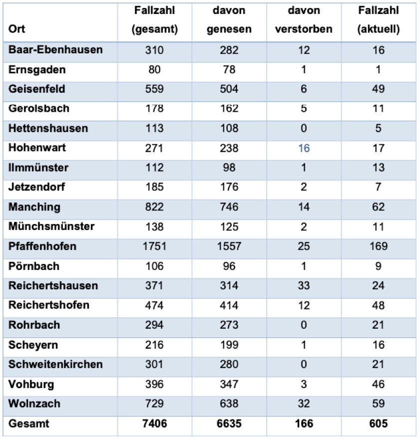 (ty) In Zusammenhang mit der Corona-Pandemie gibt es im Kreis Pfaffenhofen, wie berichtet, mittlerweile 166 Menschenleben zu beklagen. Das Landratsamt veröffentlicht eine tägliche Übersicht (Tabelle unten), in welchen Gemeinden die mit dem Virus infizierten Menschen, die gestorben sind, gelebt haben beziehungsweise wie viele bestätigte Infektionsfälle und genesene Patienten es in welcher Kommune gibt. Die Zahl der Landkreis-Bürger, die positiv auf den neuartigen Erreger getestet worden sind, hat sich seit der Meldung von gestern um 77 erhöht und beträgt somit aktuell 7406. Seit 2. September gelten bayernweit völlig neue Corona-Regeln (Details siehe unten).