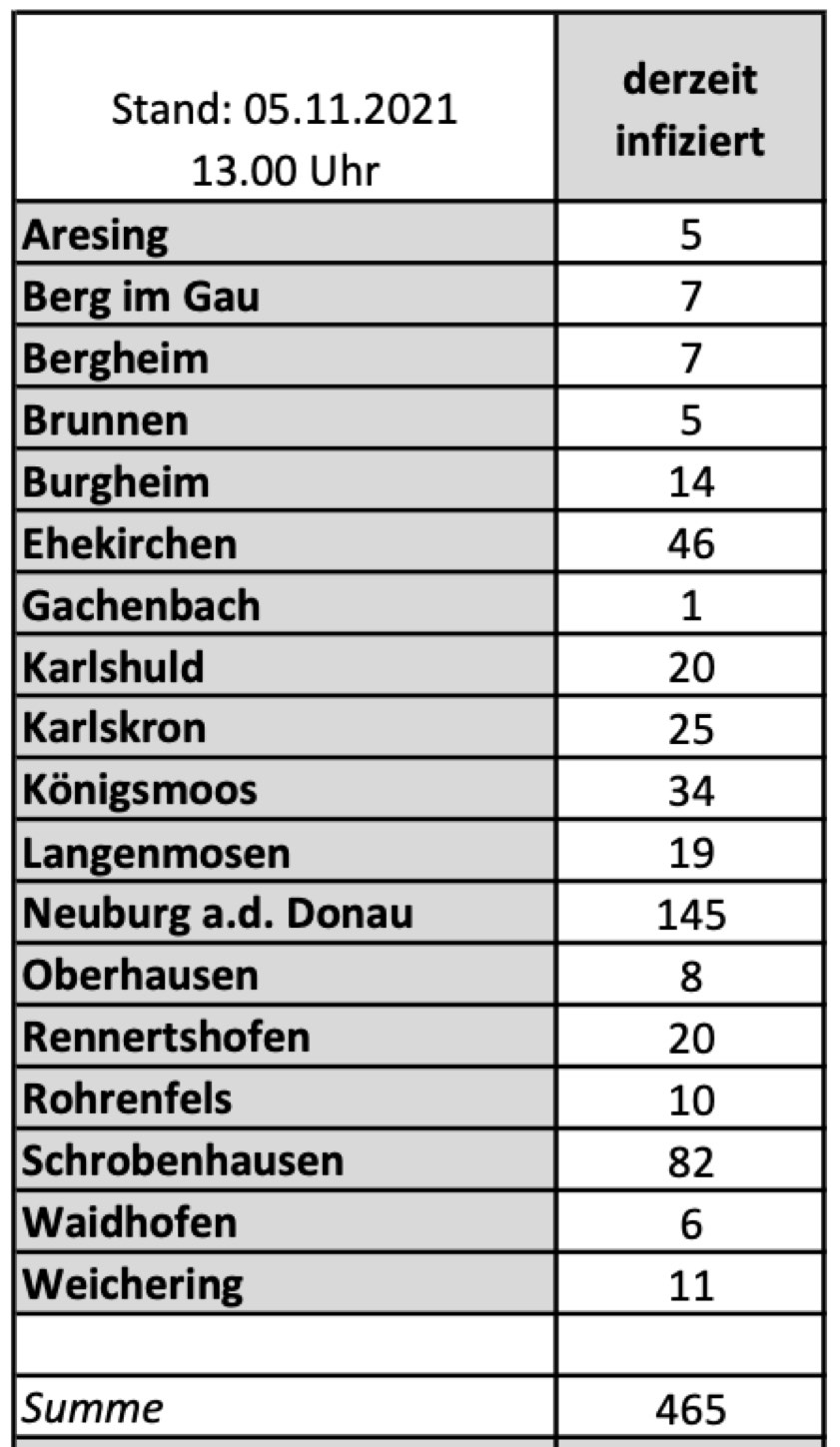 (ty) Im Kreis Neuburg-Schrobenhausen gibt es in Zusammenhang mit der Corona-Pandemie, wie berichtet, mittlerweile 87 Menschenleben zu beklagen. Die weitere Situation im Kreis stellt sich laut aktuellen Angaben des Landratsamts wie folgt dar: Bislang – Stand: heute, 13 Uhr – wurden insgesamt 5518 Landkreis-Bürger positiv auf den neuartigen Erreger getestet. Das sind 76 mehr als gestern gemeldet. Von den Infizierten gelten mittlerweile 4966 als genesen – 14 mehr als gestern gemeldet. Momentan gebe es im Landkreis 465 aktive Corona-Fälle (gestern: 403). Aktuelle Zahlen aus den Gemeinden zeigt die Tabelle unten. Seit 2. September gelten bayernweit völlig neue Corona-Regeln (Details siehe unten).