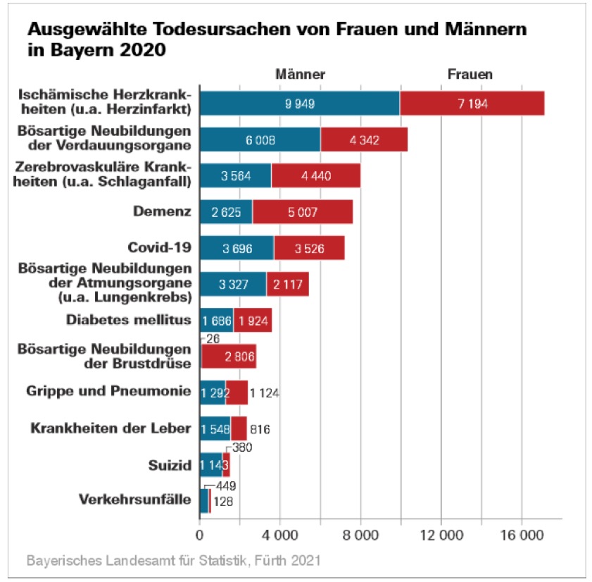 Im vergangenen Jahr starben laut Landesamt für Statistik in Bayern insgesamt 7222 Menschen nachweislich an Covid-19, davon 3526 Frauen und 3696 Männer. Covid-19 als Einzeldiagnose war im vergangenen Jahr somit häufiger als die Todes-Ursachen Herzinfarkt oder Lungenkrebs. Etwa neun von zehn der an Covid-19 gestorbenen Frauen und Männer waren 70 Jahre oder älter. Der Anteil derer, die im Jahr 2020 nachweislich an Covid-19 starben, lag bei fünf Prozent.