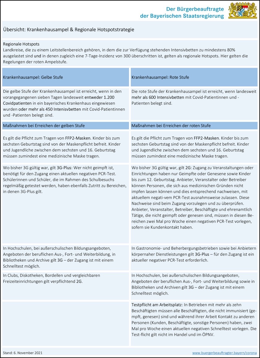 Der bayerische Ministerrat hatte bekanntlich in seiner jüngsten Sitzung für den Freistaat geänderte Maßnahmen im Kampf gegen die Corona-Pandemie beschlossen. Die bisherigen Regelungen wurden zum Teil ergänzt und mitunter verschärft. An den Schulen kehrt die Masken-Pflicht zurück. Die Krankenhaus-Ampel wurde erweitert. Neu ist eine regionale Hotspot-Regelung, die in den betroffenen Landkreisen die Maßnahmen nach sich zieht, die der landesweiten roten Klinik-Ampel entsprechen. Änderungen gibt es auch bei der Quarantäne. Um die Einhaltung der jeweils geltenden Vorgaben sicherzustellen, sollen Schwerpunkt- und Stichproben-Kontrollen erfolgen sowie Verstöße "konsequent geahndet" werden. Hier die jüngsten Beschlüsse sowie die seit 6. November geltenden Regelungen im Detail: Diese geänderten Corona-Regelungen gelten ab 6. November in Bayern