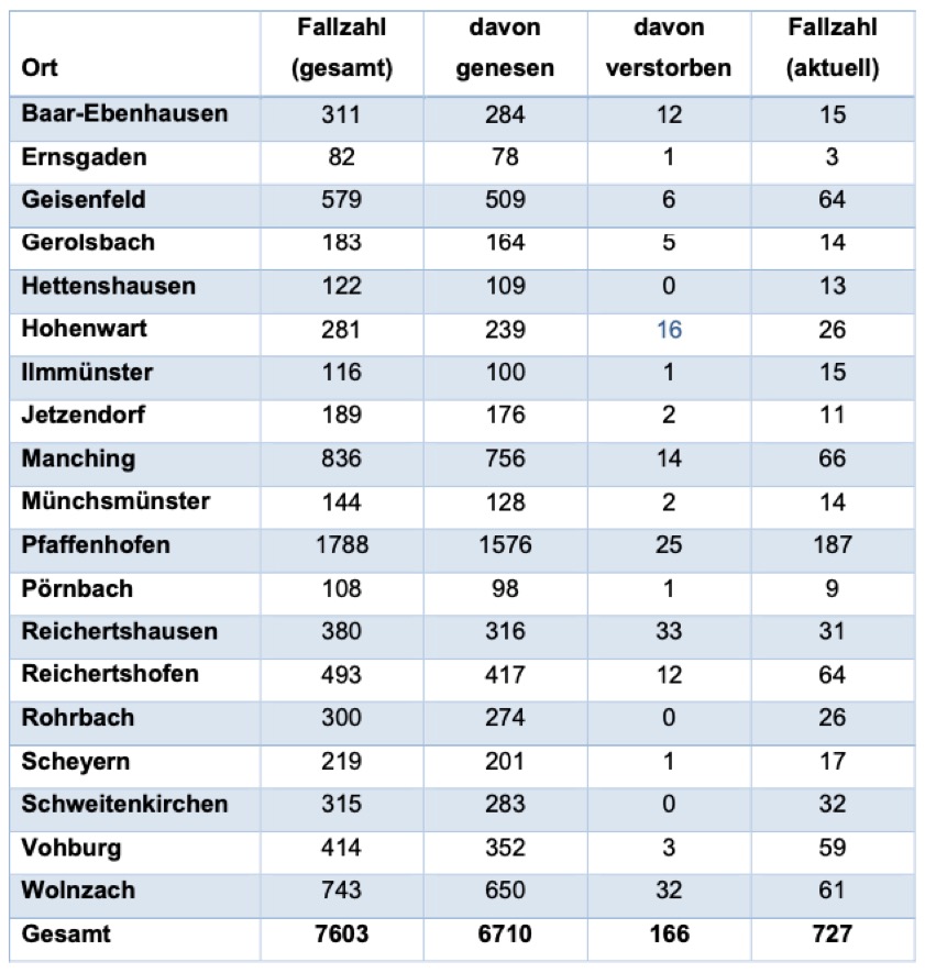 (ty) In Zusammenhang mit der Corona-Pandemie gibt es im Kreis Pfaffenhofen, wie berichtet, mittlerweile 166 Menschenleben zu beklagen. Das Landratsamt veröffentlicht eine tägliche Übersicht (Tabelle unten), in welchen Gemeinden die mit dem Virus infizierten Menschen, die gestorben sind, gelebt haben beziehungsweise wie viele bestätigte Infektionsfälle und genesene Patienten es in welcher Kommune gibt. Die Zahl der Landkreis-Bürger, die positiv auf den neuartigen Erreger getestet worden sind, hat sich seit der Meldung von Freitag um 197 erhöht und beträgt somit aktuell 7603. Seit 2. September gelten bayernweit völlig neue Corona-Regeln (Details siehe unten), seit 7. November gibt es Verschärfungen.