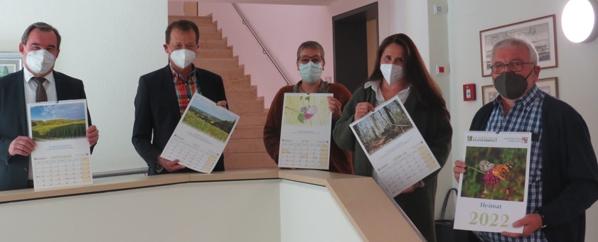 Bei der Vorstellung des Natur-Kalenders für 2022: Landrat Albert Gürtner (von links), Franz Schreyer (Geschäftsführer des Vereins "Hilfe für das behinderte Kind"), Schul-Leiterin Brigitte Kolb, Elternbeirats-Vorsitzende Sibylle Roithmayr und Fotograf Heinz Huber. Foto: Rottler