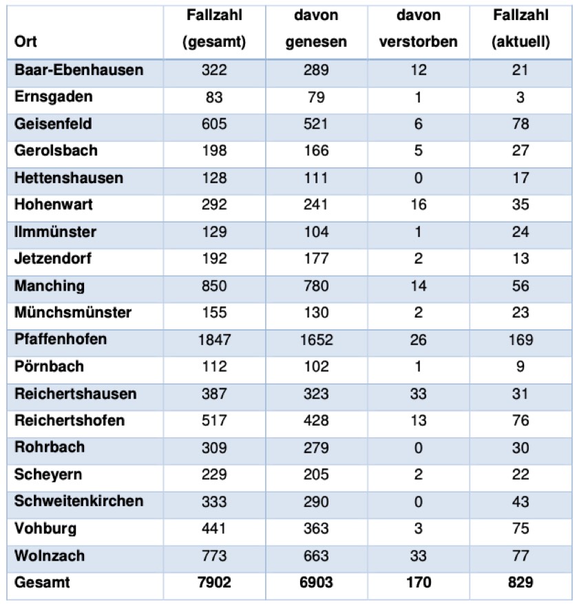 Von den bislang insgesamt 7902 Menschen aus dem Kreis Pfaffenhofen, bei denen nach jüngstem offiziellen Stand eine Corona-Infektion bestätigt worden ist, gelten laut aktueller Mitteilung der Behörde mittlerweile 6903 als genesen – das sind 64 mehr als gestern gemeldet. Die Zahl der infizierten und noch nicht genesenen Corona-Patienten hat sich damit im Landkreis deutlich erhöht und beträgt – Stand: heute Nachmittag – derzeit 829 (gestern: 769). Die infizierten Personen befinden sich in häuslicher Isolation.