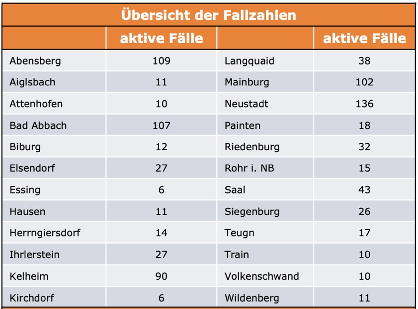 (ty) Im Kreis Kelheim gibt es in Zusammenhang mit der Corona-Pandemie, wie berichtet, mittlerweile 116 Menschenleben zu beklagen. Die weitere Situation stellt sich wie folgt dar: Unter Verweis auf Daten des Gesundheitsamts teilte das Landratsamt heute mit, dass – Stand gestern, 16 Uhr – die Zahl der im Kreis Kelheim positiv auf den neuartigen Erreger getesteten Menschen bei insgesamt 9036 liegt: Das sind 112 mehr als gestern gemeldet. Insgesamt 8032 hiesige Corona-Patienten (gestern: 7959) wurden wieder aus der Quarantäne entlassen und gelten als genesen. Derzeit gebe es 888 aktive Corona-Fälle im Landkreis (gestern: 849). Zahlen aus den einzelnen Gemeinden zeigt die Tabelle unten. Seit 3. November gelten im Kreis Kelheim verschärfte Maßnahmen (Details siehe unten); mittlerweile greifen aber auch bayernweit deutliche Verschärfungen.