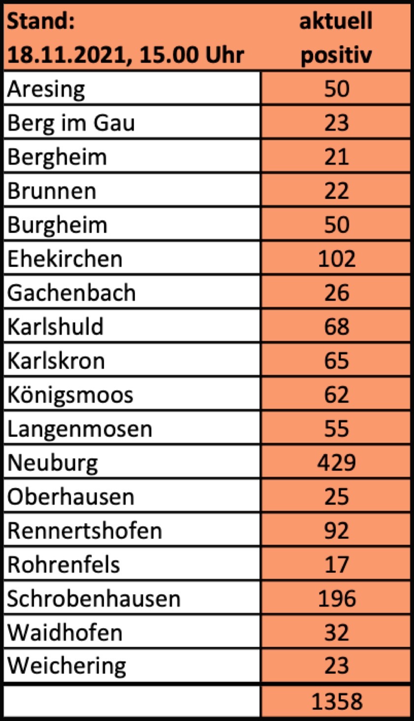 (ty) Im Kreis Neuburg-Schrobenhausen gibt es in Zusammenhang mit der Corona-Pandemie, wie berichtet, mittlerweile 92 Menschenleben zu beklagen. Die weitere Situation im Kreis stellt sich laut aktuellen Angaben des Landratsamts wie folgt dar: Bislang – Stand: heute, 15 Uhr – wurden insgesamt 6718 Landkreis-Bürger positiv auf den neuartigen Erreger getestet. Das sind 141 mehr als gestern gemeldet. Von den Infizierten gelten mittlerweile 5268 als genesen – 33 mehr als gestern. Momentan gebe es im Landkreis 1358 aktive Corona-Fälle (gestern: 1250). Aktuelle Zahlen aus den Gemeinden zeigt die Tabelle unten. Seit 16. November gelten bayernweit weitere Regel-Verschärfungen (Details siehe unten).