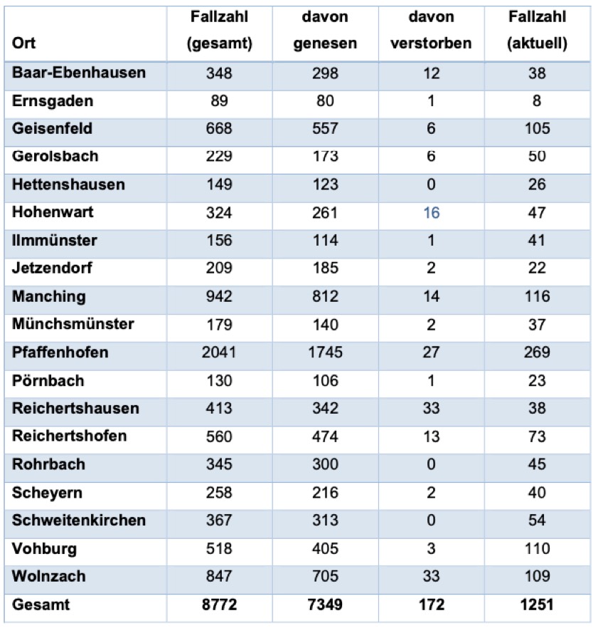 (ty) In Zusammenhang mit der Corona-Pandemie gibt es im Kreis Pfaffenhofen, wie berichtet, mittlerweile 172 Menschenleben zu beklagen. Das Landratsamt veröffentlicht eine tägliche Übersicht (Tabelle unten), in welchen Gemeinden die mit dem Virus infizierten Menschen, die gestorben sind, gelebt haben beziehungsweise wie viele bestätigte Infektionsfälle und genesene Patienten es in welcher Kommune gibt. Die Zahl der Landkreis-Bürger, die positiv auf den neuartigen Erreger getestet worden sind, hat sich seit der Meldung von gestern um 135 erhöht und beträgt somit aktuell 8772. Seit 16. November gelten bayernweit weitere Regel-Verschärfungen (Details siehe unten).