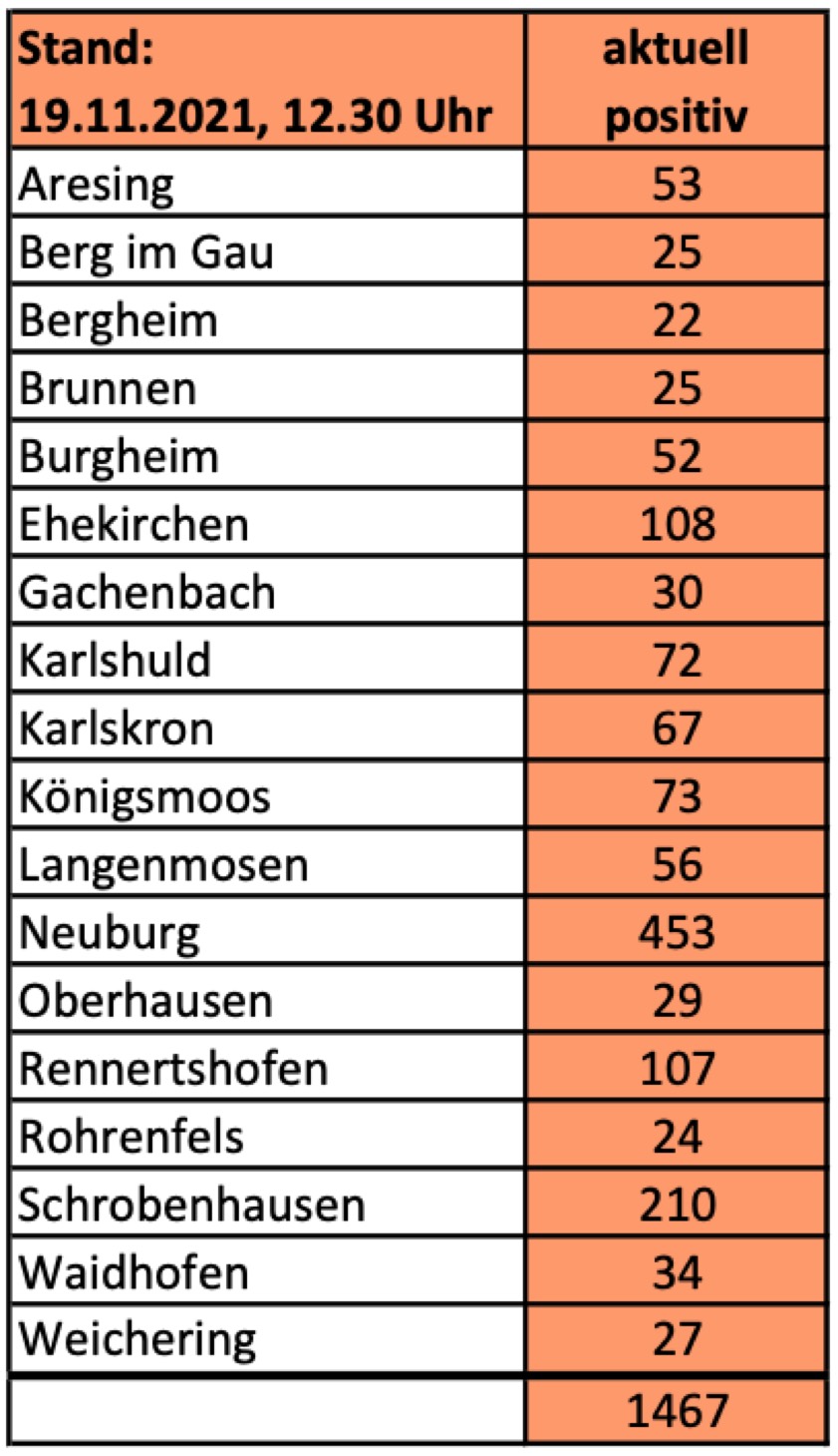 (ty) Im Kreis Neuburg-Schrobenhausen gibt es in Zusammenhang mit der Corona-Pandemie, wie berichtet, mittlerweile 92 Menschenleben zu beklagen. Die weitere Situation im Kreis stellt sich laut aktuellen Angaben des Landratsamts wie folgt dar: Bislang – Stand: heute, 12.30 Uhr – wurden insgesamt 6827 Landkreis-Bürger positiv auf den neuartigen Erreger getestet. Das sind 109 mehr als gestern gemeldet. Von den Infizierten gelten mittlerweile 5268 als genesen – unverändert seit gestern. Momentan gebe es im Landkreis 1467 aktive Corona-Fälle (gestern: 1358). Aktuelle Zahlen aus den Gemeinden zeigt die Tabelle unten. Seit 16. November gelten bayernweit weitere Regel-Verschärfungen (Details siehe unten).