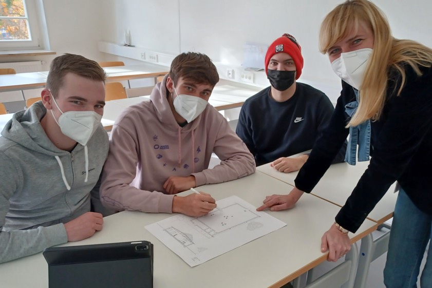 Studiengang-Leiterin Professorin Jana Bochert bespricht mit Patrick Seel (von links), Maximilian Gottschall und Shayan Thiele das Projekt.
