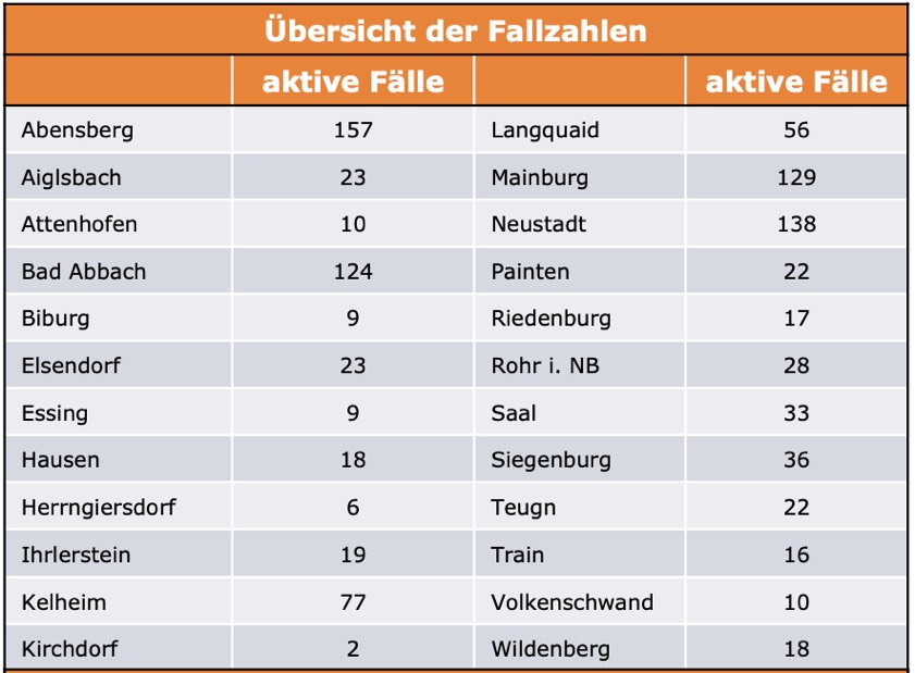 (ty) Im Kreis Kelheim gibt es in Zusammenhang mit der Corona-Pandemie ein weiteres Menschenleben zu beklagen. Wie das Landratsamt heute gegenüber unserer Redaktion erklärte, ist ein mit dem Virus infizierter Mann (Jahrgang 1932) gestorben. Damit erhöht sich die Zahl der Corona-Toten im Landkreis auf nunmehr 121. Die weitere Situation stellt sich wie folgt dar: Unter Verweis auf Daten des Gesundheitsamts teilte das Landratsamt heute mit, dass – Stand gestern, 16 Uhr – die Zahl der im Kreis Kelheim positiv auf den neuartigen Erreger getesteten Menschen bei insgesamt 9944 liegt: Das sind 127 mehr als gestern gemeldet. Insgesamt 8821 hiesige Corona-Patienten (gestern: 8667) wurden wieder aus der Quarantäne entlassen und gelten als genesen. Derzeit gebe es 1002 aktive Corona-Fälle im Landkreis (gestern: 1030). Zahlen aus den einzelnen Gemeinden zeigt die Tabelle unten. Seit 24. November gelten bayernweit massive Regel-Verschärfungen.