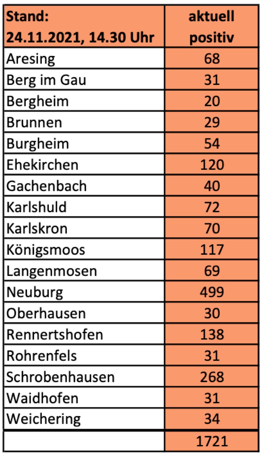 (ty) Im Kreis Neuburg-Schrobenhausen gibt es in Zusammenhang mit der Corona-Pandemie, wie berichtet, mittlerweile 92 Menschenleben zu beklagen. Die weitere Situation im Kreis stellt sich laut aktuellen Angaben des Landratsamts wie folgt dar: Bislang – Stand: heute, 14.30 Uhr – wurden insgesamt 7384 Landkreis-Bürger positiv auf den neuartigen Erreger getestet. Das sind 171 mehr als gestern gemeldet. Von den Infizierten gelten mittlerweile 5571 als genesen – 136 mehr als gestern. Momentan gebe es im Landkreis 1721 aktive Corona-Fälle (gestern: 1685). Aktuelle Zahlen aus den Gemeinden zeigt die Tabelle unten. Seit 24. November gelten bayernweit massive Regel-Verschärfungen (Details siehe unten).