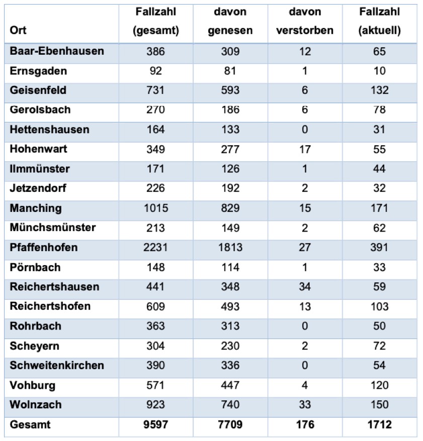 (ty) In Zusammenhang mit der Corona-Pandemie gibt es im Kreis Pfaffenhofen ein weiteres Menschenleben zu beklagen. Wie das Landratsamt heute mitteilte, ist eine mit dem Virus infizierte Person im Alter von 80 Jahren aus der Gemeinde Vohburg gestorben. Damit erhöht sich die Zahl der Corona-Toten im Landkreis auf 176. Das Landratsamt veröffentlicht eine tägliche Übersicht (Tabelle unten), in welchen Gemeinden die mit dem Virus infizierten Menschen, die gestorben sind, gelebt haben beziehungsweise wie viele bestätigte Infektionsfälle und genesene Patienten es in welcher Kommune gibt. Die Zahl der Landkreis-Bürger, die positiv auf den neuartigen Erreger getestet worden sind, hat sich seit der Meldung von gestern um 141 erhöht und beträgt somit aktuell 9597. Seit 24. November gelten bayernweit massive Regel-Verschärfungen (Details siehe unten).