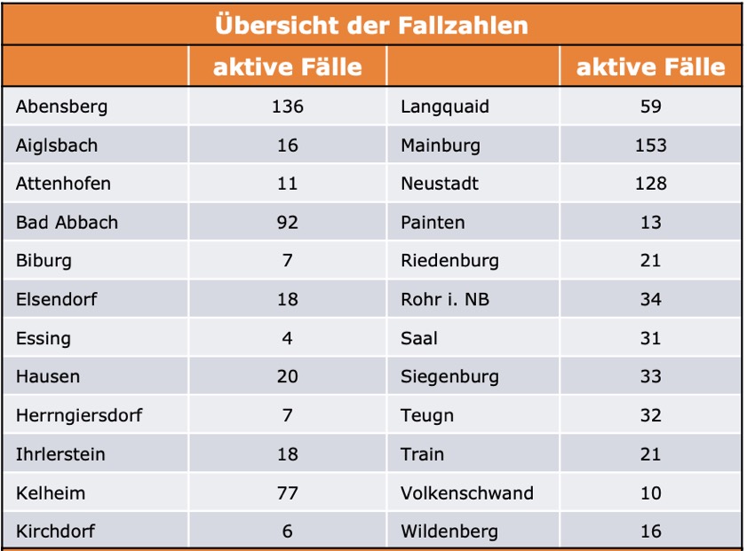 (ty) Im Kreis Kelheim gibt es in Zusammenhang mit der Corona-Pandemie ein weiteres Menschenleben zu beklagen. Wie das Landratsamt heute gegenüber unserer Redaktion erklärte, ist ein mit dem Virus infizierter Mann (Jahrgang 1944) gestorben, der unter Vorerkrankungen litt. Damit erhöht sich die Zahl der Corona-Toten im Landkreis auf nunmehr 125. Die weitere Situation stellt sich wie folgt dar: Unter Verweis auf Daten des Gesundheitsamts teilte das Landratsamt heute mit, dass – Stand gestern, 16 Uhr – die Zahl der im Kreis Kelheim positiv auf den neuartigen Erreger getesteten Menschen bei insgesamt 10 697 liegt: Das sind 107 mehr als gestern gemeldet. Insgesamt 9609 hiesige Corona-Patienten (gestern: 9451) wurden wieder aus der Quarantäne entlassen und gelten als genesen. Derzeit gebe es 963 aktive Corona-Fälle im Landkreis (gestern: 1015). Zahlen aus den einzelnen Gemeinden zeigt die Tabelle unten. Seit 24. November gelten bayernweit massive Regel-Verschärfungen.