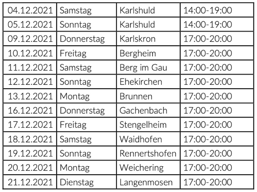 Den ganzen Dezember über seien die mobilen Impf-Teams des BRK – wie ebenfalls bereits angekündigt – in den verschiedenen Landkreis-Gemeinden unterwegs: Sie böten dabei ebenfalls sowohl Erst- und Zweit-Impfungen gegen das Corona-Virus als auch Auffrischungs-Impfungen an. "Bislang stehen die Termine für zwölf Gemeinden", wurde heute noch einmal aus dem Landratsamt bestätigt (siehe Übersichts-Tabelle unten). Die genauen Impforte in den genannten Gemeinden sowie etwaige weiteren Termine sollen noch über die Medien und über die Homepage des Landkreises unter www.neuburg-schrobenhausen.de bekanntgegeben werden.