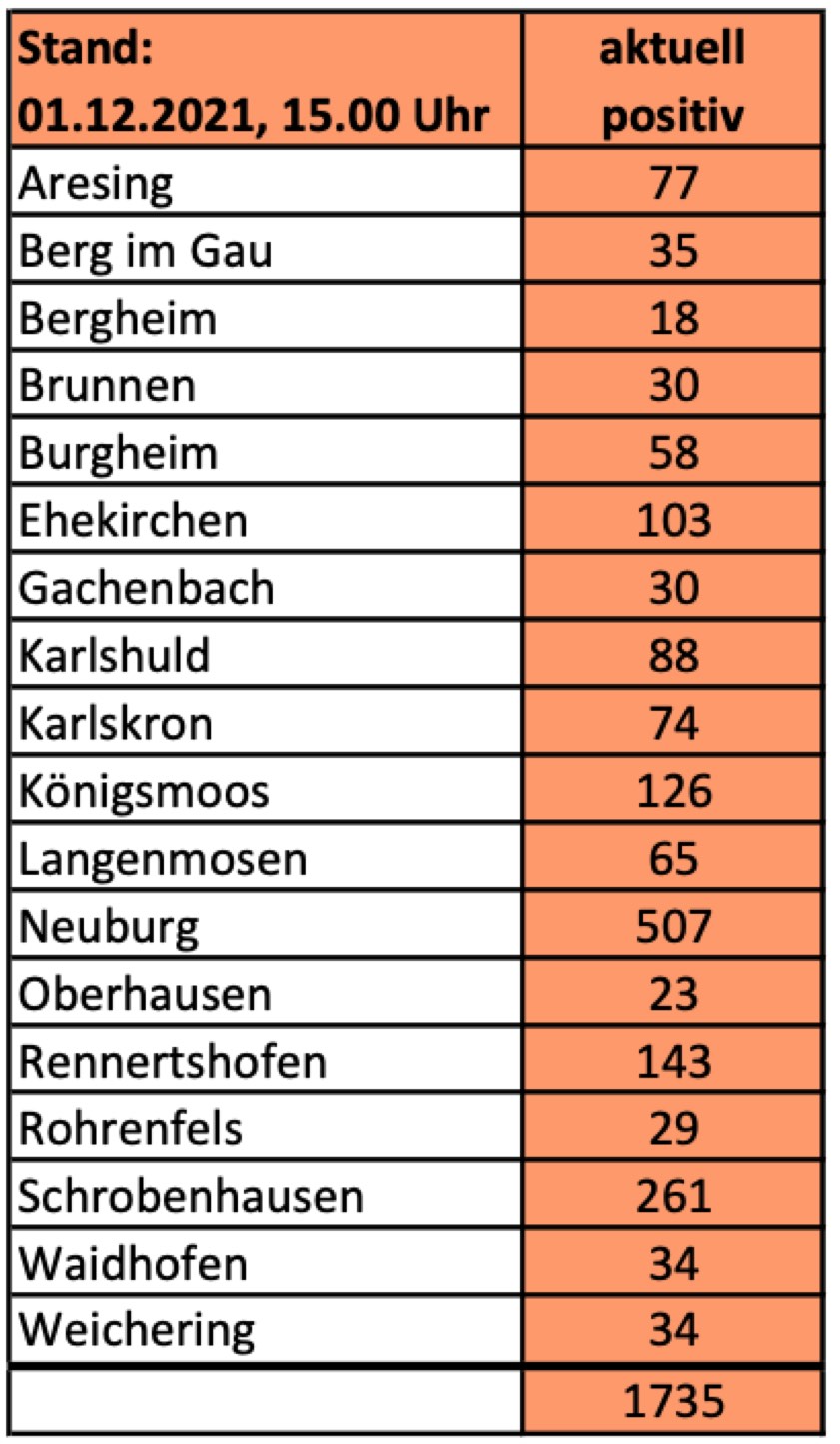 (ty) Im Kreis Neuburg-Schrobenhausen gibt es in Zusammenhang mit der Corona-Pandemie ein weiteres Menschenleben zu beklagen. Wie das Landratsamt heute gegenüber unserer Redaktion erklärte, ist ein Mann im Alter von rund 80 Jahren gestorben, der zum Todeszeitpunkt als infiziert galt. Damit erhöht sich die Zahl der Corona-Toten im Landkreis auf 94. Die weitere Situation im Kreis stellt sich laut aktuellen Angaben des Landratsamts wie folgt dar: Bislang – Stand: heute, 15 Uhr – wurden insgesamt 8031 Landkreis-Bürger positiv auf den neuartigen Erreger getestet. Das sind 105 mehr als gestern gemeldet. Von den Infizierten gelten mittlerweile 6202 als genesen – 83 mehr als gestern. Momentan gebe es im Landkreis 1735 aktive Corona-Fälle (gestern: 1714). Aktuelle Zahlen aus den Gemeinden zeigt die Tabelle unten. Seit 24. November gelten bayernweit massive Regel-Verschärfungen (Details siehe unten).