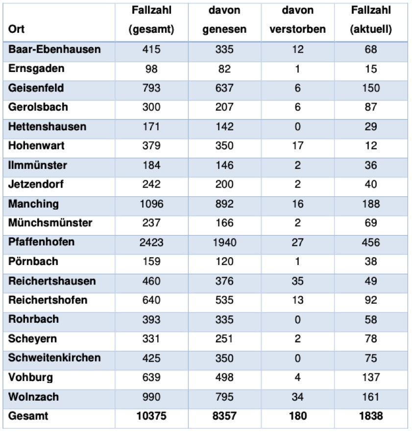 (ty) In Zusammenhang mit der Corona-Pandemie gibt es im Kreis Pfaffenhofen zwei weitere Menschenleben zu beklagen. Wie das Landratsamt heute mitteilte, sind zwei positiv auf den Erreger getestete Personen im Alter von jeweils über 90 Jahren aus den Gemeinden Manching und Wolnzach gestorben. Damit erhöht sich die Zahl der Corona-Toten im Kreis auf nunmehr 180. Das Landratsamt veröffentlicht eine tägliche Übersicht (Tabelle unten), in welchen Gemeinden die mit dem Virus infizierten Menschen, die gestorben sind, gelebt haben beziehungsweise wie viele bestätigte Infektionsfälle und genesene Patienten es in welcher Kommune gibt. Die Zahl der Landkreis-Bürger, die positiv auf den neuartigen Erreger getestet worden sind, hat sich seit der Meldung von gestern um 128 erhöht und beträgt somit aktuell 10 375. Seit 24. November gelten bayernweit massive Regel-Verschärfungen (Details siehe unten).