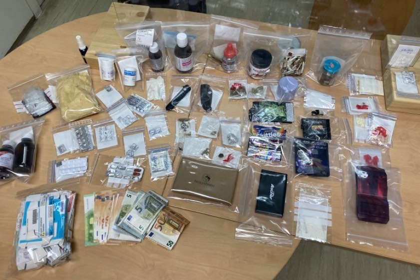 Weil der 19-Jährige ein auffälliges Verhalten gezeigt habe, sei ein Drogen-Vortest durchgeführt worden. Dieser habe positiv auf THC und Kokain reagiert. Im Zuge der anschließenden Durchsuchungs-Maßnamen seien in einem Rucksack unter anderem folgende Sachen gefunden worden: ein so genanntes Einhandmesser, ein Springmesser, ein nach erster Inaugenscheinnahme gefälschter 100-Euro Schein, mehrere Tüten und Behälter mit diversen Betäubungsmitteln und rezeptpflichtigen Arzneimitteln sowie "diverse andere Drogen-Utensilien" (Foto oben).