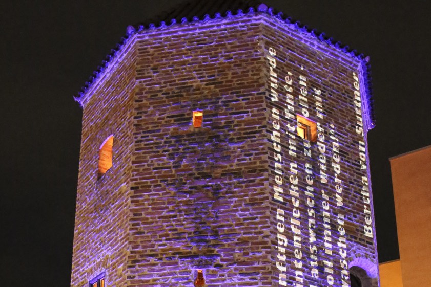 Die Kreisstadt beteiligt sich seit mehreren Jahren mit einer Illumination des Hungerturms an dem Aktionstag. Das Zitat auf der Fassade lautet diesmal: "Keinem vernünftigen Menschen wird es einfallen Tintenflecken mit Tinte, Ölflecken mit Öl wegputzen zu wollen – nur Blut, das soll immer wieder mit Blut ausgewaschen werden!" Seit 2002 seien fast 300 Städte aus Deutschland an dem Aktionstag gegen die Todesstrafe beteiligt. Er gehe zurück auf eine Initiative der Gemeinschaft Sant'Egidio, die in Zusammenarbeit mit anderen Organisationen zu dem internationalen Aktionstag aufrufe. Der 30. November sei gewählt worden, weil an diesem Tag im Jahr 1786 das Großherzogtum Toskana als erster Staat der Welt Folter und Todesstrafe für abgeschafft erklärt habe.