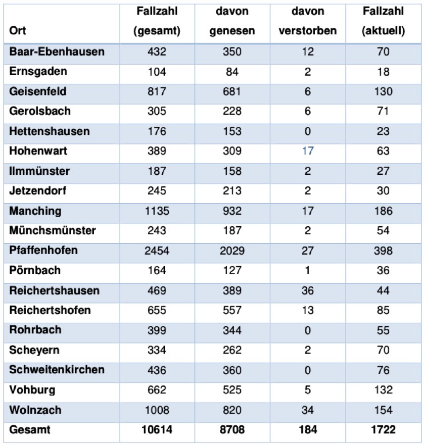 (ty) In Zusammenhang mit der Corona-Pandemie gibt es im Kreis Pfaffenhofen drei weitere Menschenleben zu beklagen. Wie das Landratsamt heute mitteilte, sind drei positiv auf den Erreger getestete Personen im Alter von über 70 Jahren aus den Gemeinden Ernsgaden, Manching und Vohburg gestorben. Damit erhöht sich die Zahl der Corona-Toten im Kreis auf nunmehr 184. Das Landratsamt veröffentlicht eine tägliche Übersicht (Tabelle unten), in welchen Gemeinden die mit dem Virus infizierten Menschen, die gestorben sind, gelebt haben beziehungsweise wie viele bestätigte Infektionsfälle und genesene Patienten es in welcher Kommune gibt. Die Zahl der Landkreis-Bürger, die positiv auf den neuartigen Erreger getestet worden sind, hat sich seit der Meldung von gestern um 31 erhöht und beträgt somit aktuell 10 614. Seit 4. Dezember gelten bayernweit weitere massive Regel-Verschärfungen (Details siehe unten).