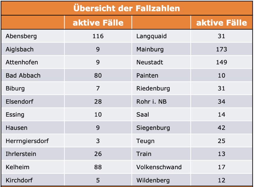 (ty) Im Kreis Kelheim gibt es in Zusammenhang mit der Corona-Pandemie zwei weitere Menschenleben zu beklagen. Wie das Landratsamt heute gegenüber unserer Redaktion erklärte, sind ein Mann (Jahrgang 1929) und eine Frau (Jahrgang 1966) gestorben, die mit dem Virus infiziert waren und nicht an Vorerkrankungen litten. Damit erhöht sich die Zahl der Corona-Toten im Landkreis auf 127. Die weitere Situation stellt sich wie folgt dar: Unter Verweis auf Daten des Gesundheitsamts teilte das Landratsamt heute mit, dass – Stand gestern, 16 Uhr – die Zahl der im Kreis Kelheim positiv auf den neuartigen Erreger getesteten Menschen bei insgesamt 11 371 liegt: Das sind 123 mehr als gestern gemeldet. Insgesamt 10 303 hiesige Corona-Patienten (gestern: 10 183) wurden wieder aus der Quarantäne entlassen und gelten als genesen. Derzeit gebe es 941 aktive Corona-Fälle im Landkreis (gestern: 940). Zahlen aus den einzelnen Gemeinden zeigt die Tabelle unten. Seit 4. Dezember gelten bayernweit weitere massive Regel-Verschärfungen.