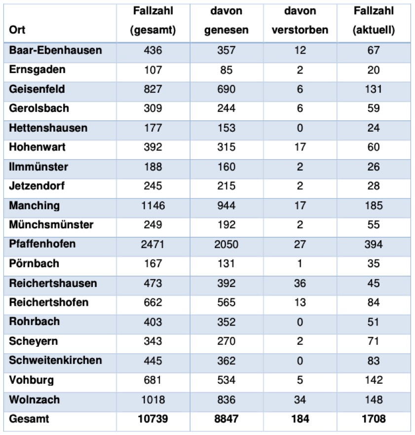 (ty) In Zusammenhang mit der Corona-Pandemie gibt es im Kreis Pfaffenhofen, wie berichtet, mittlerweile 184 Menschenleben zu beklagen. Das Landratsamt veröffentlicht eine tägliche Übersicht (Tabelle unten), in welchen Gemeinden die mit dem Virus infizierten Menschen, die gestorben sind, gelebt haben beziehungsweise wie viele bestätigte Infektionsfälle und genesene Patienten es in welcher Kommune gibt. Die Zahl der Landkreis-Bürger, die positiv auf den neuartigen Erreger getestet worden sind, hat sich seit der Meldung von gestern um 125 erhöht und beträgt somit aktuell 10 739. Seit 4. Dezember gelten bayernweit weitere massive Regel-Verschärfungen (Details siehe unten).