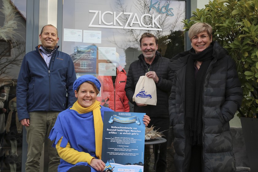 Klaus Bieber von der Caritas (von links), der Pfaffenhofener Weihnachts-Wichtel, Mathias Breitner vom Verein "Lebendige Innenstadt" und Susanne Schlittenbauer von Zickzack-Mode.