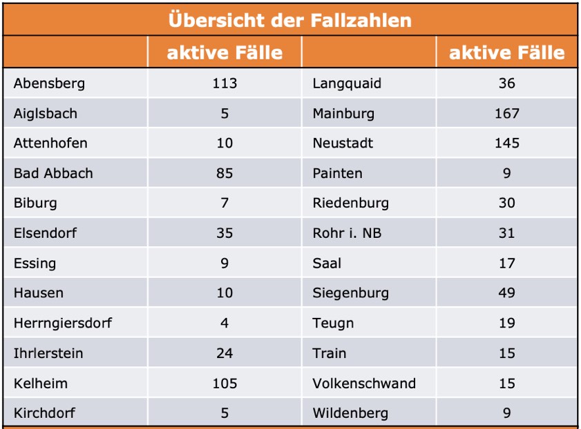 (ty) Im Kreis Kelheim gibt es in Zusammenhang mit der Corona-Pandemie, wie berichtet, mittlerweile 127 Menschenleben zu beklagen. Die weitere Situation stellt sich wie folgt dar: Unter Verweis auf Daten des Gesundheitsamts teilte das Landratsamt heute mit, dass – Stand gestern, 16 Uhr – die Zahl der im Kreis Kelheim positiv auf den neuartigen Erreger getesteten Menschen bei insgesamt 11 595 liegt: Das sind 106 mehr als gestern gemeldet. Insgesamt 10 514 hiesige Corona-Patienten (gestern: 10 418) wurden wieder aus der Quarantäne entlassen und gelten als genesen. Derzeit gebe es 954 aktive Corona-Fälle im Landkreis (gestern: 944). Zahlen aus den einzelnen Gemeinden zeigt die Tabelle unten. Seit 4. Dezember gelten bayernweit weitere massive Regel-Verschärfungen.