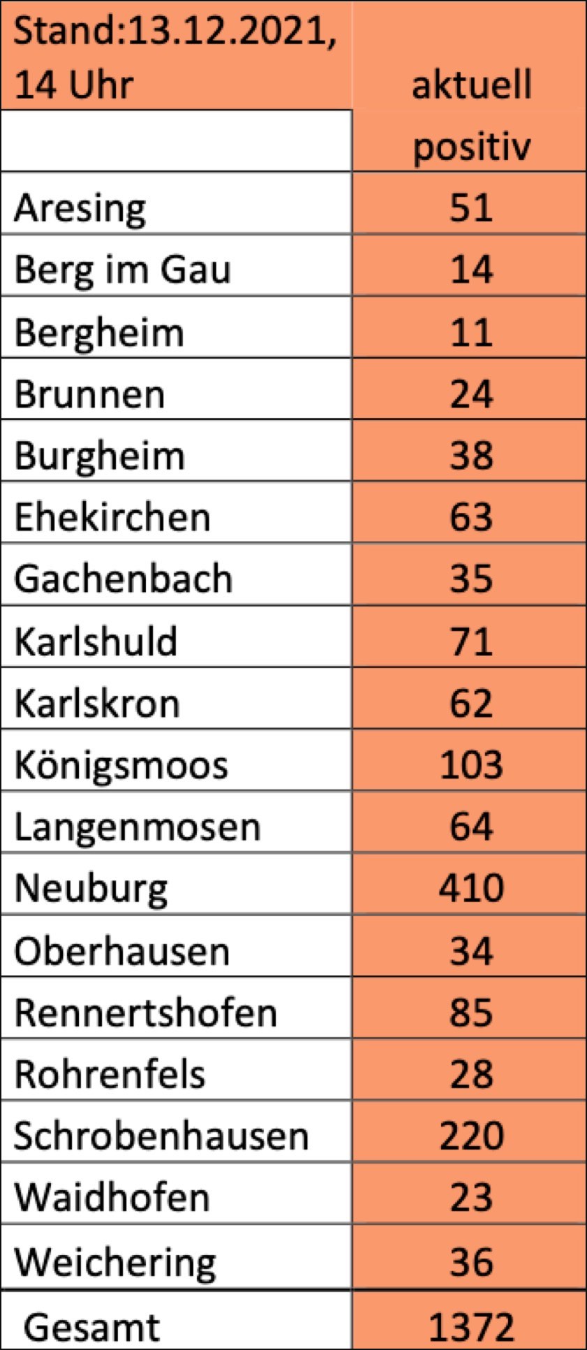 (ty) Im Kreis Neuburg-Schrobenhausen gibt es in Zusammenhang mit der Corona-Pandemie ein weiteres Menschenleben zu beklagen. Wie das Landratsamt heute gegenüber unserer Redaktion mitteilte, ist ein mit dem Virus infizierter hochbetagter Mann gestorben. Damit erhöht sich die Zahl der Corona-Toten im Kreis auf 108. Die weitere Situation im Kreis stellt sich laut aktuellen Angaben des Landratsamts wie folgt dar: Bislang – Stand: heute, 14 Uhr – wurden insgesamt 8798 Landkreis-Bürger positiv auf den neuartigen Erreger getestet. Das sind 115 mehr als am Freitag gemeldet. Von den Infizierten gelten mittlerweile 7318 als genesen – 187 mehr als am Freitag. Momentan gebe es im Landkreis 1372 aktive Corona-Fälle (Freitag: 1445). Aktuelle Zahlen aus den Gemeinden zeigt die Tabelle unten. Seit 4. Dezember gelten bayernweit weitere massive Regel-Verschärfungen (Details siehe unten).