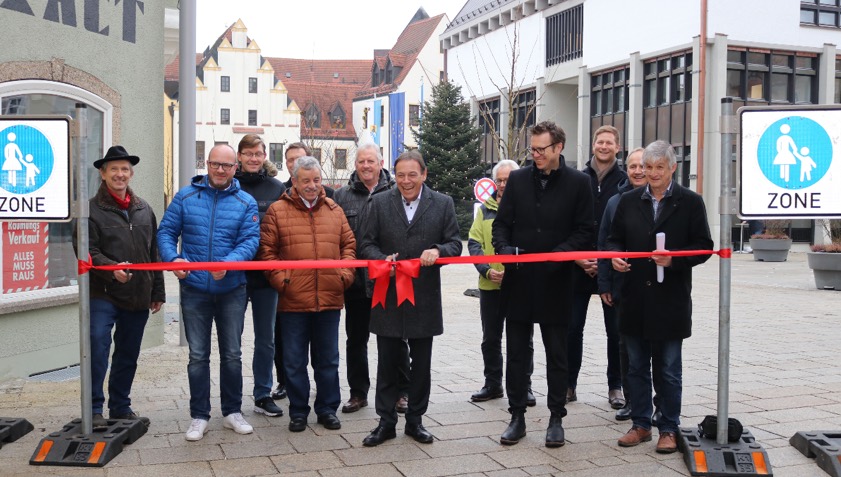 Pandemie-bedingt war nach Angaben aus der Stadtverwaltung auf eine große Feier verzichtet worden. Den neuen Lenbachplatz aber still und heimlich zu öffnen, das wollten Rathaus-Chef Reisner und die Stadtverwaltung aber auch nicht. Die engsten Mitwirkenden, darunter Vertreter der involvierten Baufirmen sowie Vertreter aus Stadtverwaltung und Politik waren deshalb am heutigen Vormittag eingeladen, um die Wiedereröffnung des Areals zu begehen. Als kleine Aufmerksamkeit erhielt jeder Gast von Reisner einen Lebkuchen und eine Flasche Glühwein. (Foto: Stadt Schrobenhausen)