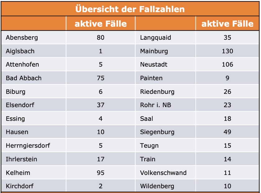 (ty) Im Kreis Kelheim gibt es in Zusammenhang mit der Corona-Pandemie, wie berichtet, mittlerweile 127 Menschenleben zu beklagen. Die weitere Situation stellt sich wie folgt dar: Unter Verweis auf Daten des Gesundheitsamts teilte das Landratsamt heute mit, dass – Stand gestern, 16 Uhr – die Zahl der im Kreis Kelheim positiv auf den neuartigen Erreger getesteten Menschen bei insgesamt 11 783 liegt: Das sind 60 mehr als gestern gemeldet. Insgesamt 10 873 hiesige Corona-Patienten (gestern: 10 805) wurden wieder aus der Quarantäne entlassen und gelten als genesen. Derzeit gebe es 783 aktive Corona-Fälle im Landkreis (gestern: 791). Zahlen aus den einzelnen Gemeinden zeigt die Tabelle unten. Seit 4. Dezember gelten bayernweit weitere massive Regel-Verschärfungen.