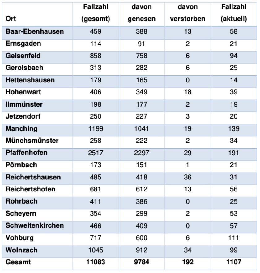 (ty) In Zusammenhang mit der Corona-Pandemie gibt es im Kreis Pfaffenhofen, wie berichtet, mittlerweile 192 Menschenleben zu beklagen. Das Landratsamt veröffentlicht eine tägliche Übersicht (Tabelle unten), in welchen Gemeinden die mit dem Virus infizierten Menschen, die gestorben sind, gelebt haben beziehungsweise wie viele bestätigte Infektionsfälle und genesene Patienten es in welcher Kommune gibt. Die Zahl der Landkreis-Bürger, die positiv auf den neuartigen Erreger getestet worden sind, hat sich seit der Meldung von gestern um 23 erhöht und beträgt somit aktuell 11 083. Seit 4. Dezember gelten bayernweit weitere massive Regel-Verschärfungen (Details siehe unten).