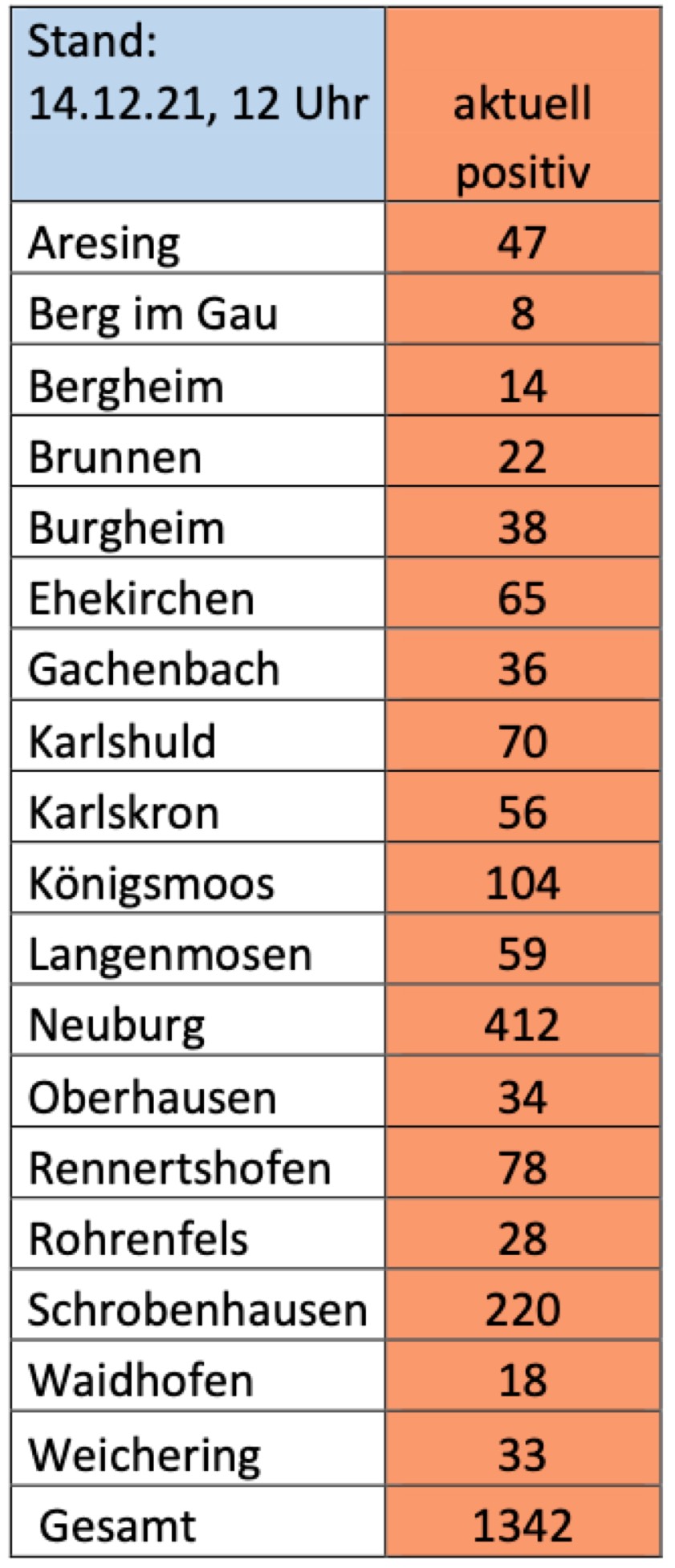(ty) Im Kreis Neuburg-Schrobenhausen gibt es in Zusammenhang mit der Corona-Pandemie, wie berichtet, mittlerweile 108 Menschenleben zu beklagen. Die weitere Situation im Kreis stellt sich laut aktuellen Angaben des Landratsamts wie folgt dar: Bislang – Stand: heute, 12 Uhr – wurden insgesamt 8874 Landkreis-Bürger positiv auf den neuartigen Erreger getestet. Das sind 76 mehr als gestern gemeldet. Von den Infizierten gelten mittlerweile 7427 als genesen – 106 mehr als gestern. Momentan gebe es im Landkreis 1342 aktive Corona-Fälle (gestern: 1372). Aktuelle Zahlen aus den Gemeinden zeigt die Tabelle unten. Seit 4. Dezember gelten bayernweit weitere massive Regel-Verschärfungen (Details siehe unten).