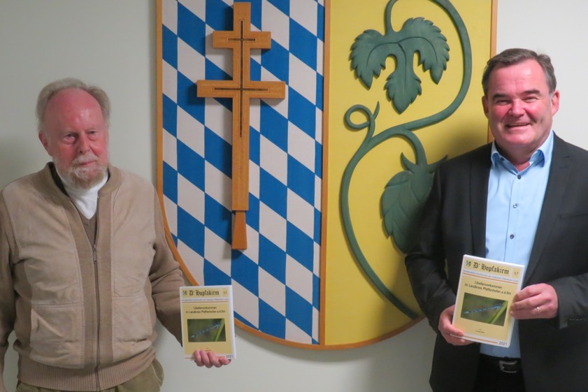 Dr. Ernst Krach (links) und Landrat Albert Gürtner bei der Vorstellung der neuen "Hopfakirm".